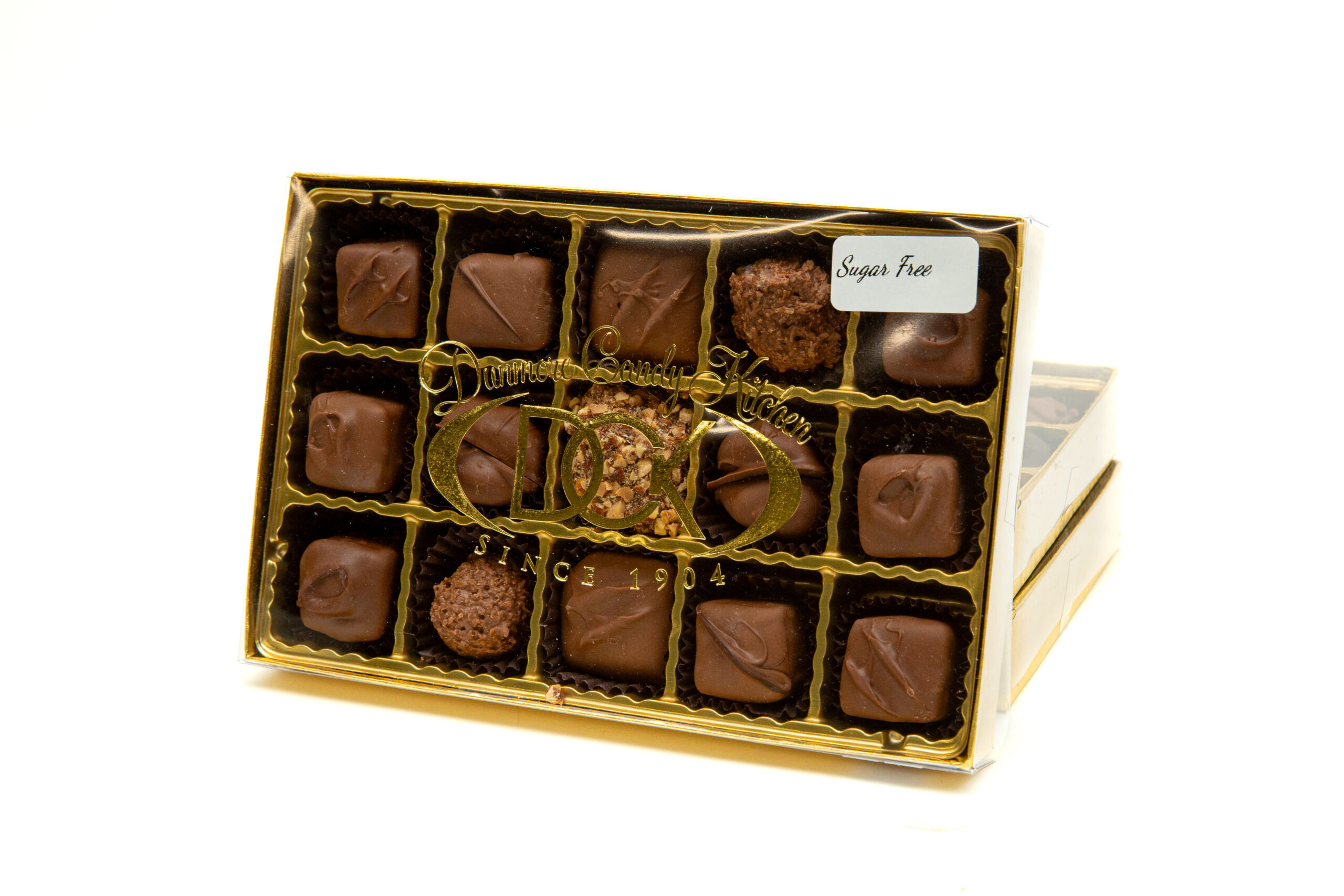 A 1/2lb Assorted Sugar Free Milk Chocolate Box including Peanut Butter Truffles, Jellies, Toffee, and more!